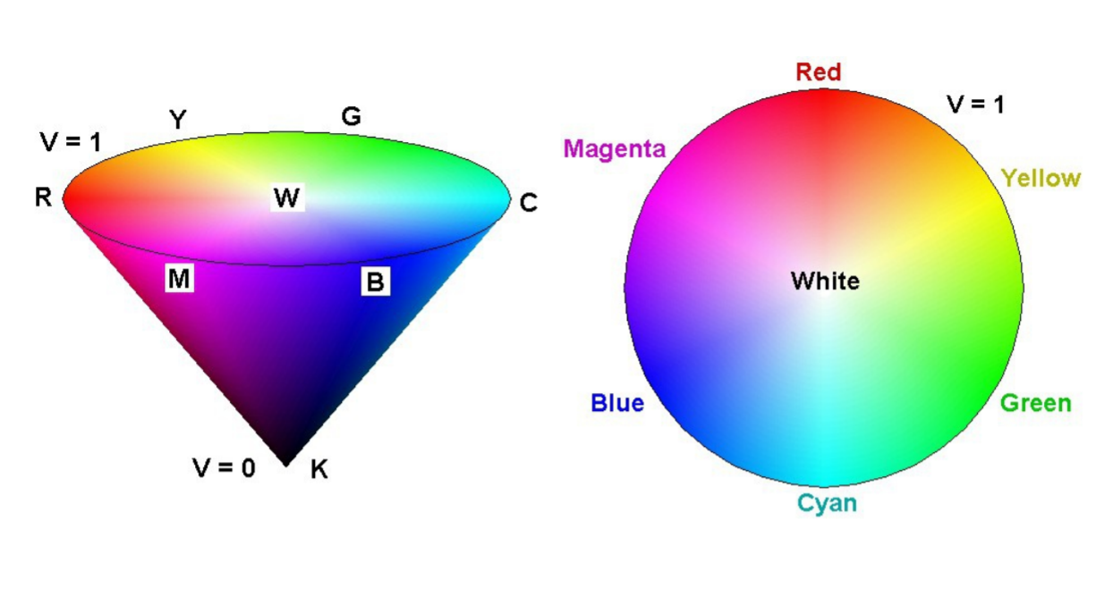 - V: jas, intenzita - rozsah 0 (černá) až 1