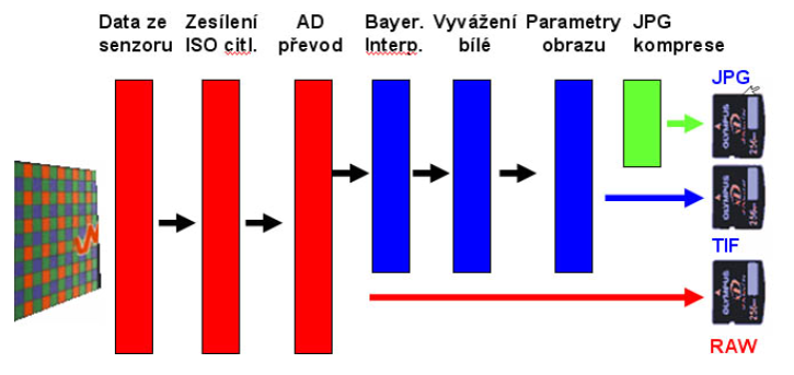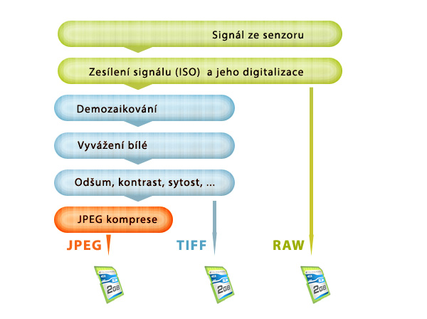 anglického surový, syrový nebo též neopracovaný) totiž žádným obrazovým souborem není. Digitální aparát používá při záznamu snímač a následně tzv. analogově-digitální (dále A/D) převodník. Na vstupu - přes objektiv a otevřenou závěrku - dopadá na snímač světlo s obrazovou informací v "analogové" podobě, výsledkem práce snímače je pak série signálů s určitými úrovněmi napětí, jež reprezentují intenzitu dopadající světelné energie. Tyto výstupní signály projdou A/D převodníkem, kde se určitým úrovním přiřadí exaktní číselné hodnoty - digitalizace obrazu. V tuto chvíli tedy fotoaparát vlastně získal soubor číselných údajů, jež vypovídají o zachyceném světle, a to ve formě číselné interpretace, s níž se dále bude pracovat. V této fázi "výroby" ještě neexistuje nic jako portrét s jemnými pleťovými odstíny nebo horská krajinka s nepřekonatelnou oblohou. Jen hromada čísel, a těm musíme v následujících fázích zpracování přiřadit významovou informaci.